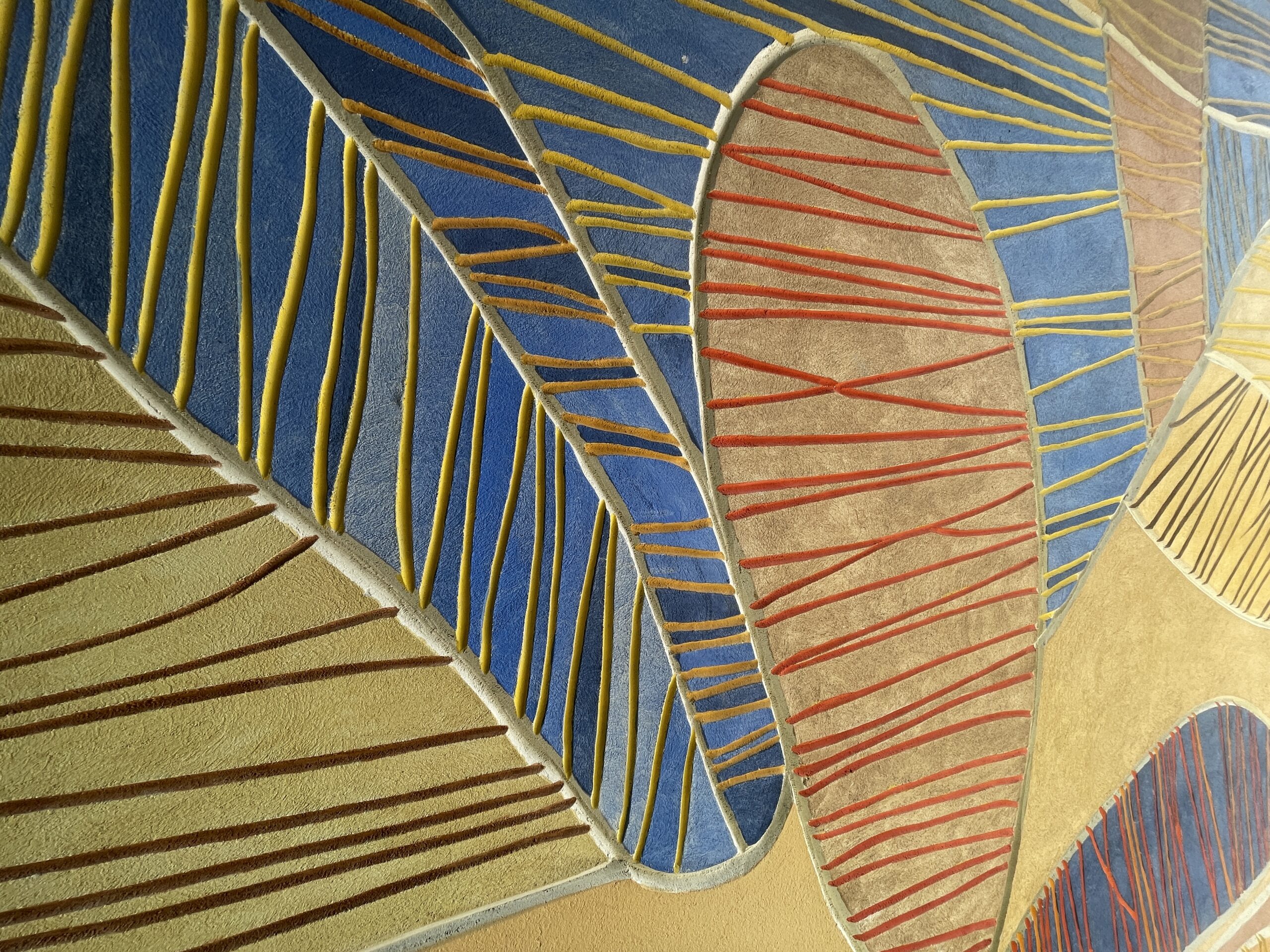 Monumentalne malarstwo ścienne zostało wykonane w technice sgraffita łączonego z techniką krzemianową. Abstrakcyjny projekt luźno nawiązuje do motywów liści.